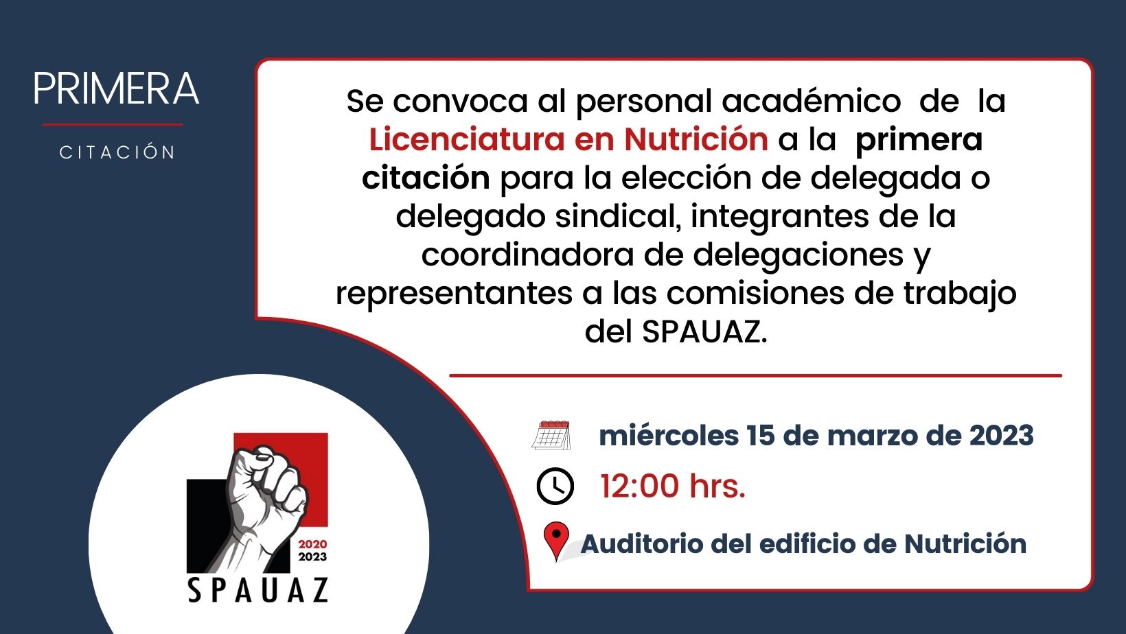 Posted in Avisos y Noticias, Prensa Primera citación para renovar delegación en la Licenciatura de Nutrición marzo 13, 2023 Más avisos... Feliz día a las y los docentes Geólogos Documento exigencia de las cargas de trabajo semestre agosto-diciembre 2021 Se otorgan dictámenes de registro a las planillas por parte de la Comisión de Dictamen y Registro del Colegio Electoral del SPAUAZ Secretaría De Deportes Del SPAUAZ Apoya Maratón De Ciclismo De Montaña