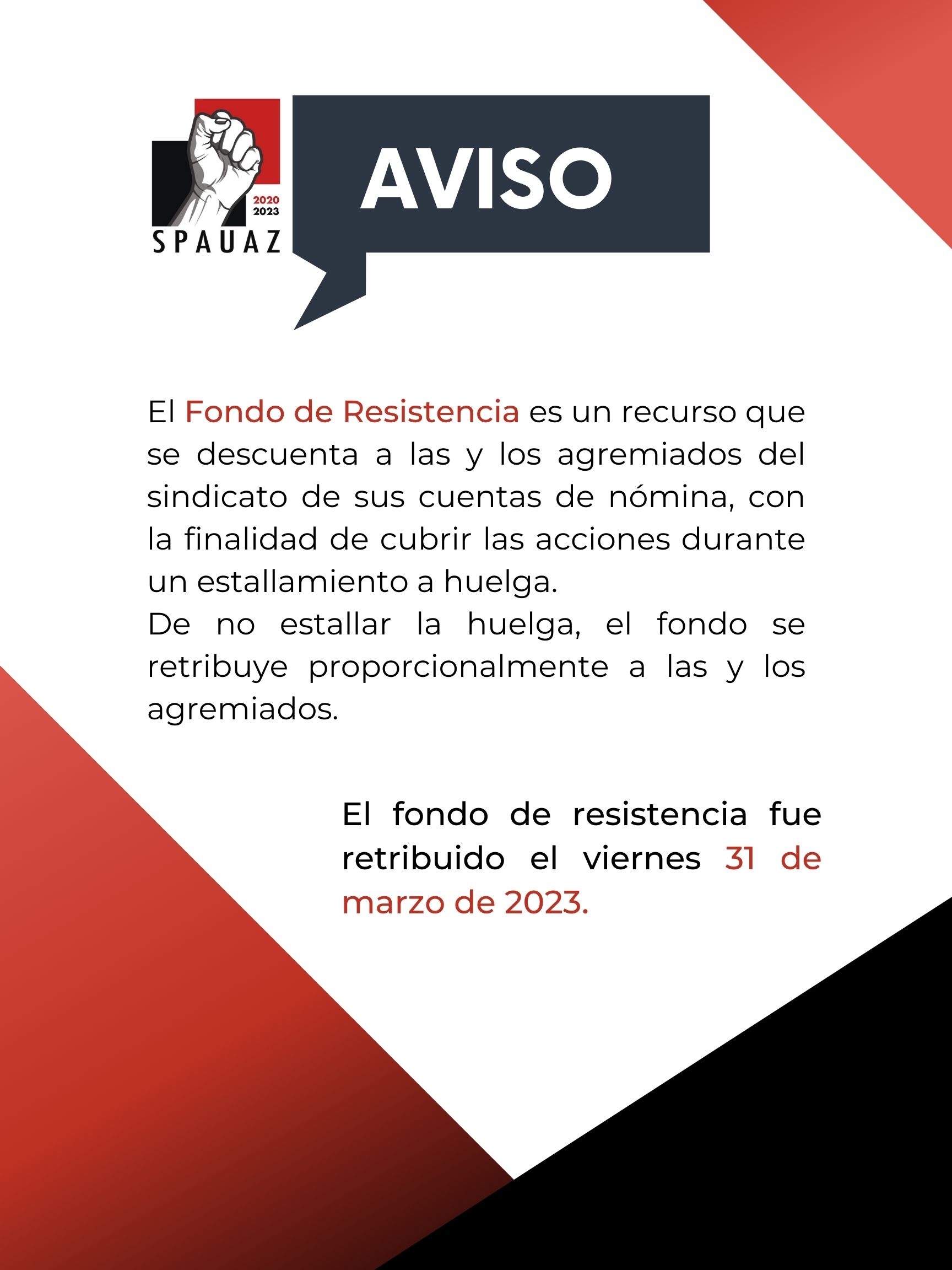 Posted in Avisos y Noticias, Finanzas Aviso fondo de resistencia 2023 abril 2, 2023 Más avisos... Inicia la huelga en el SPAUAZ ¡La fuerza de todos, la victoria de todos! #HuelgaSPAUAZ Proyecto de Convenio Conjuramiento a Huelga 2025 Citatorio para Coordinadora de Delegaciones/28 de octubre de 2022 Se reúne Comité Ejecutivo con la nueva administración de la Rectoría