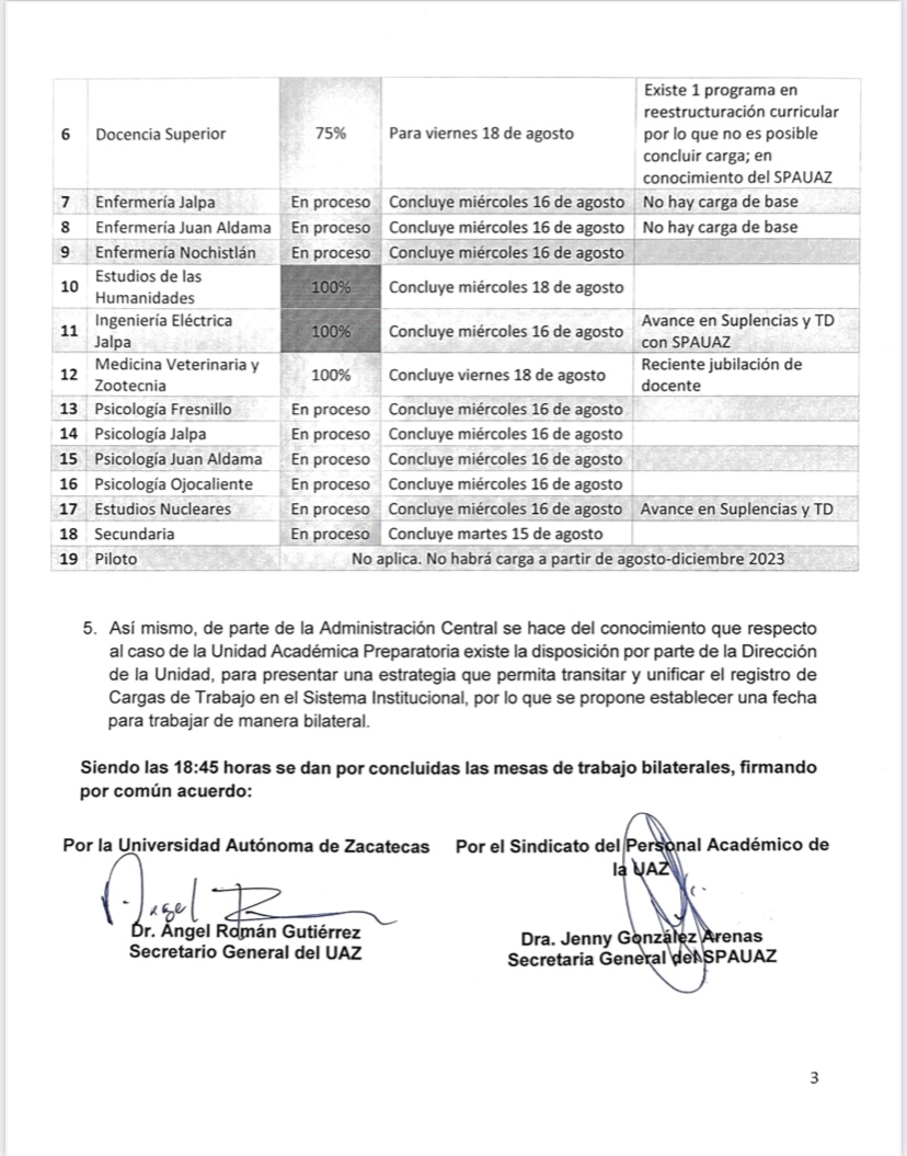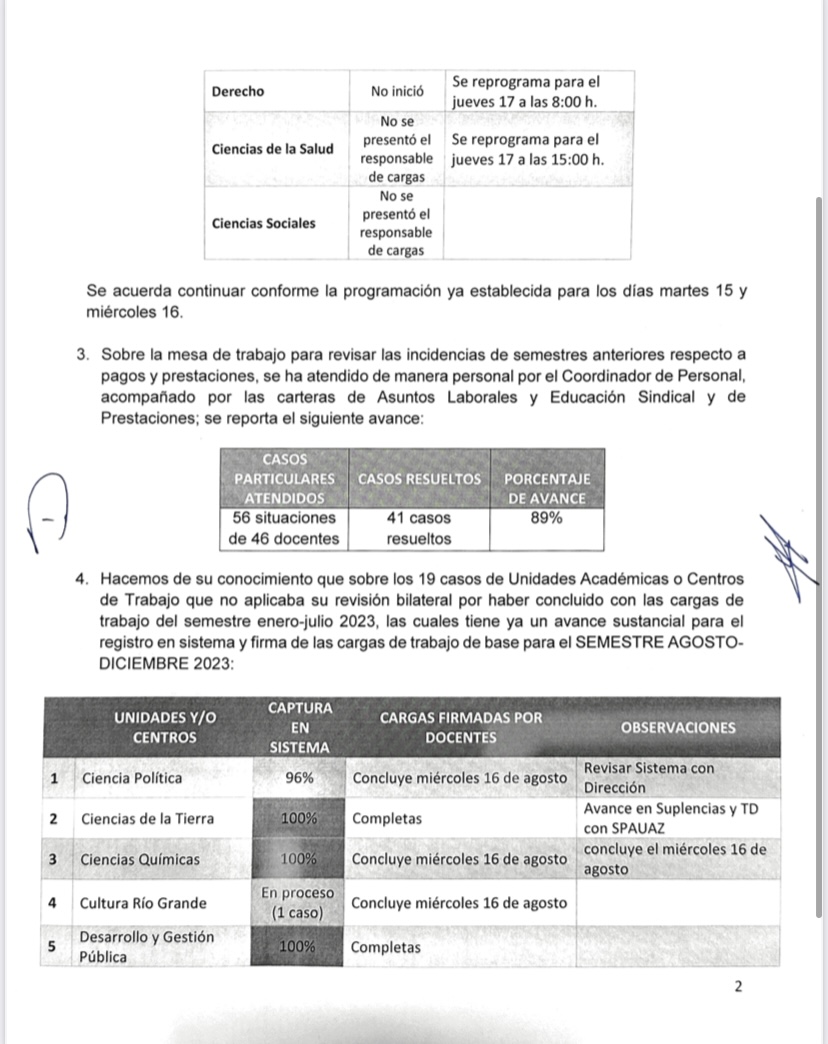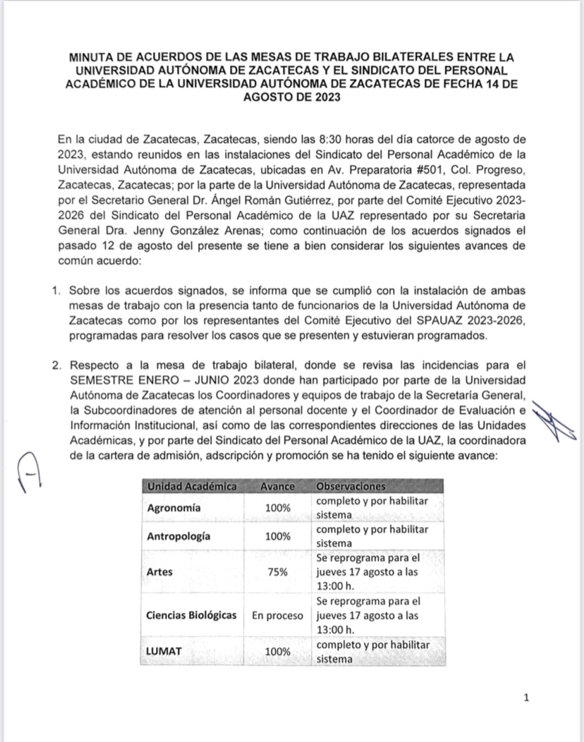 Posted in Secretaría general Minuta de acuerdos de las mesas de trabajo bilaterales entre la UAZ y el SPAUAZ de fecha 14 de agosto de 2023 agosto 15, 2023 Cargando... ¿Tarda demasiado? Recargar el documento | Abrir en una nueva pestaña Download [1.38 MB] Más avisos... Oficio No. SG/043/2023 enviado al Rector Comunicado oficial SPAUAZ 19 de marzo 2024 Pronunciamiento sobre la agresión perpetrada por la policía del estado en contra de universitarias Oficio recibido sobre Ruta Crítica para el semestre Non Agosto – Diciembre