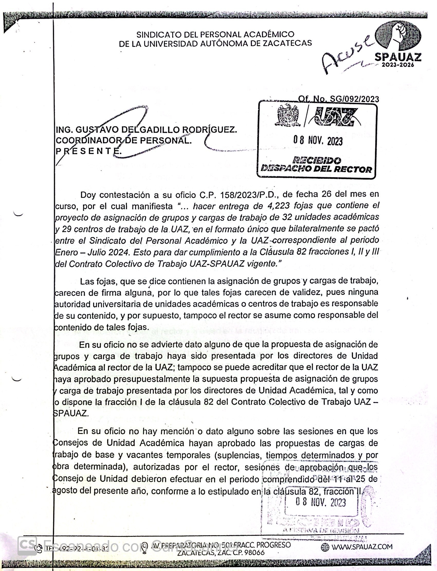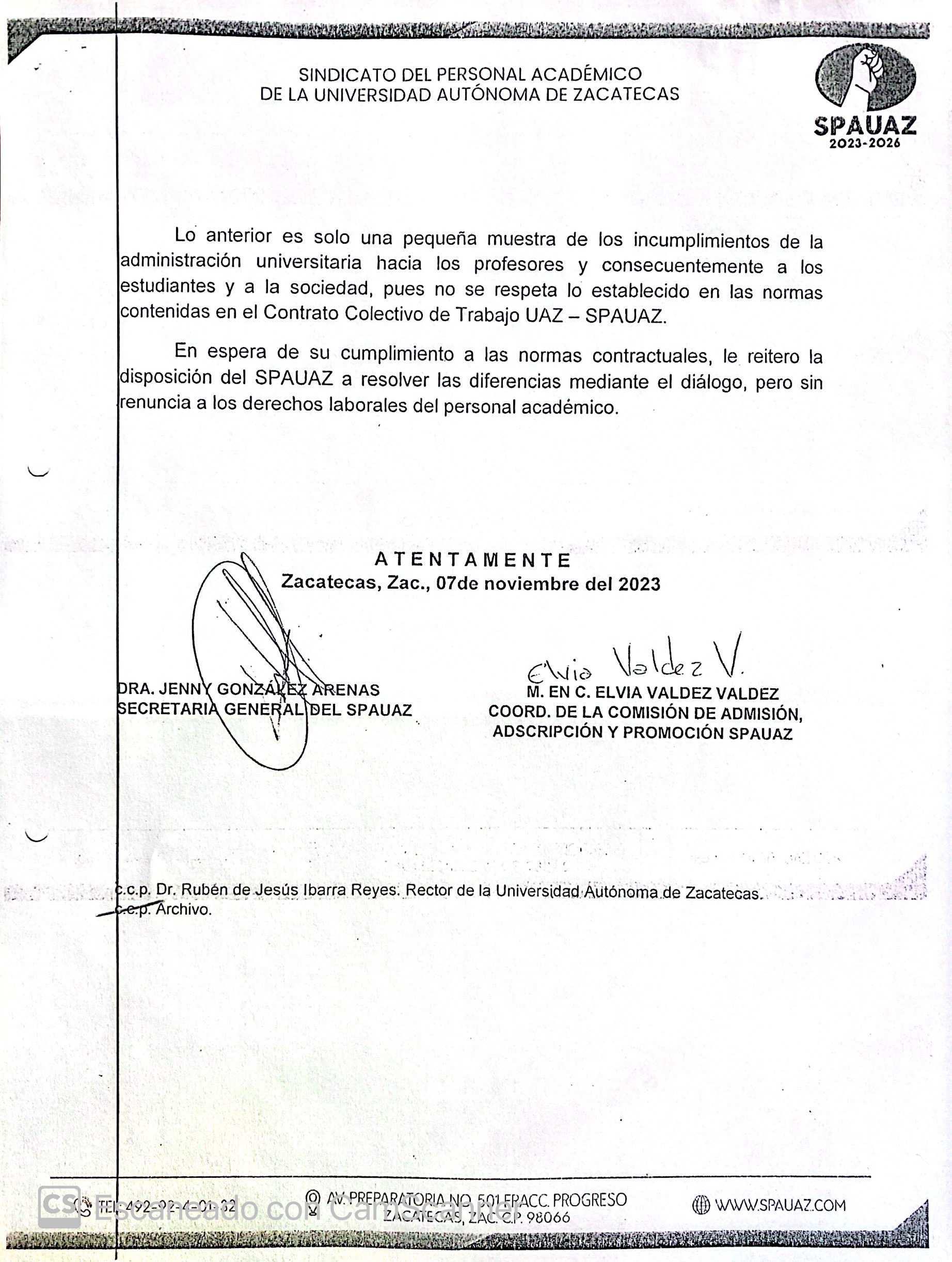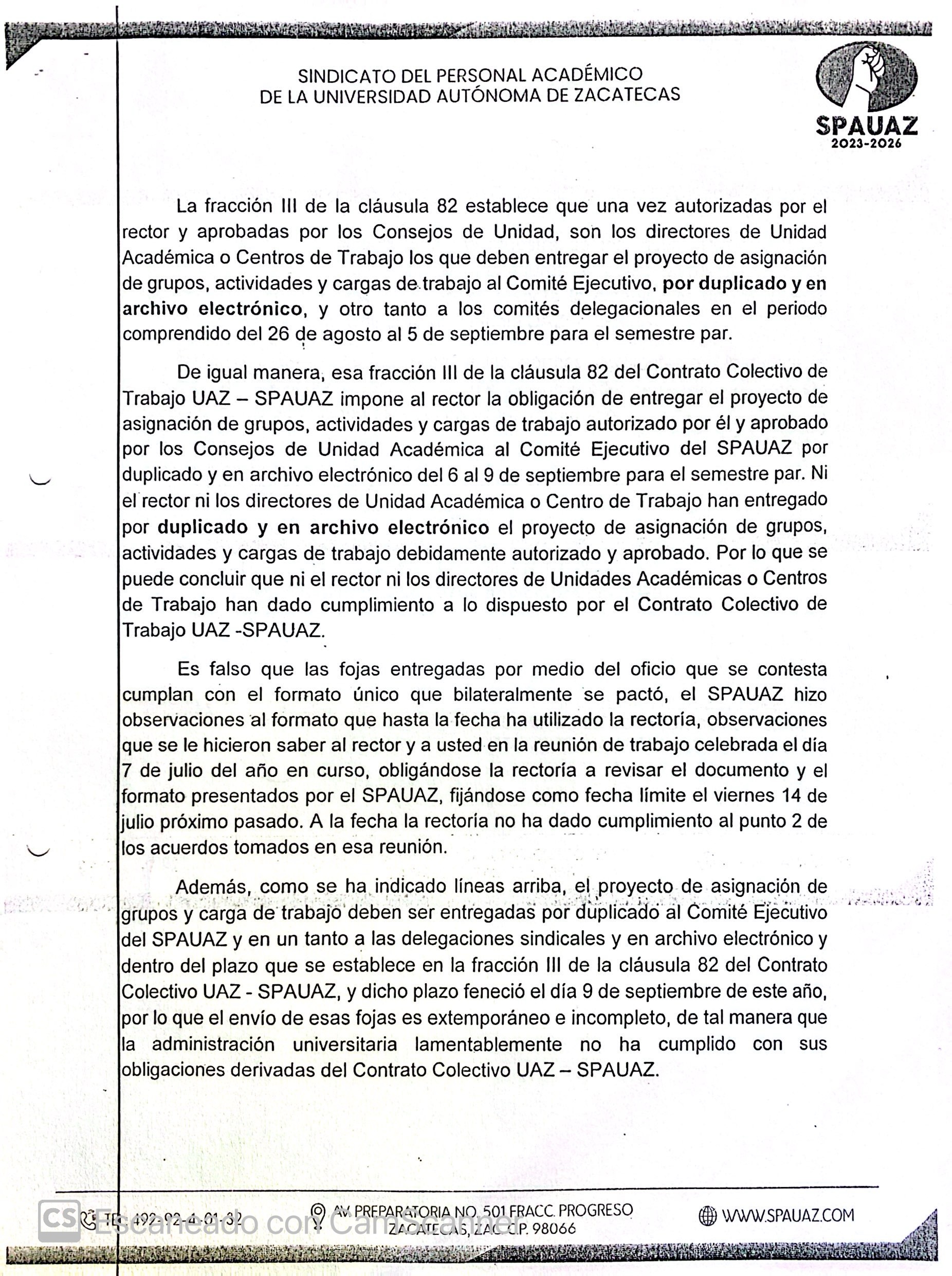 Posted in Admisión, Secretaría general Respuesta del SPAUAZ al oficio entregado por la Administración Central de la UAZ respecto a Cargas de Trabajo enero-julio 2024. noviembre 30, 2023 Respuesta del SPAUAZ al oficio entregado por la Administración Central de la UAZ respecto a Cargas de Trabajo enero-julio 2024. Más avisos... Comunicado: Procede emplazamiento a huelga presentado por el SPAUAZ ante el Tribunal Laboral Minuta de la sesión del viernes 28 de junio del 2024 de la Comisión Mixta. Minuta de la sesión extraordinaria de la comisión mixta, la parte patronal no asistió a la cita. 15 de marzo 2024 Minuta de la sesión del miércoles 10 de abril 2024 de la Comisión Mixta