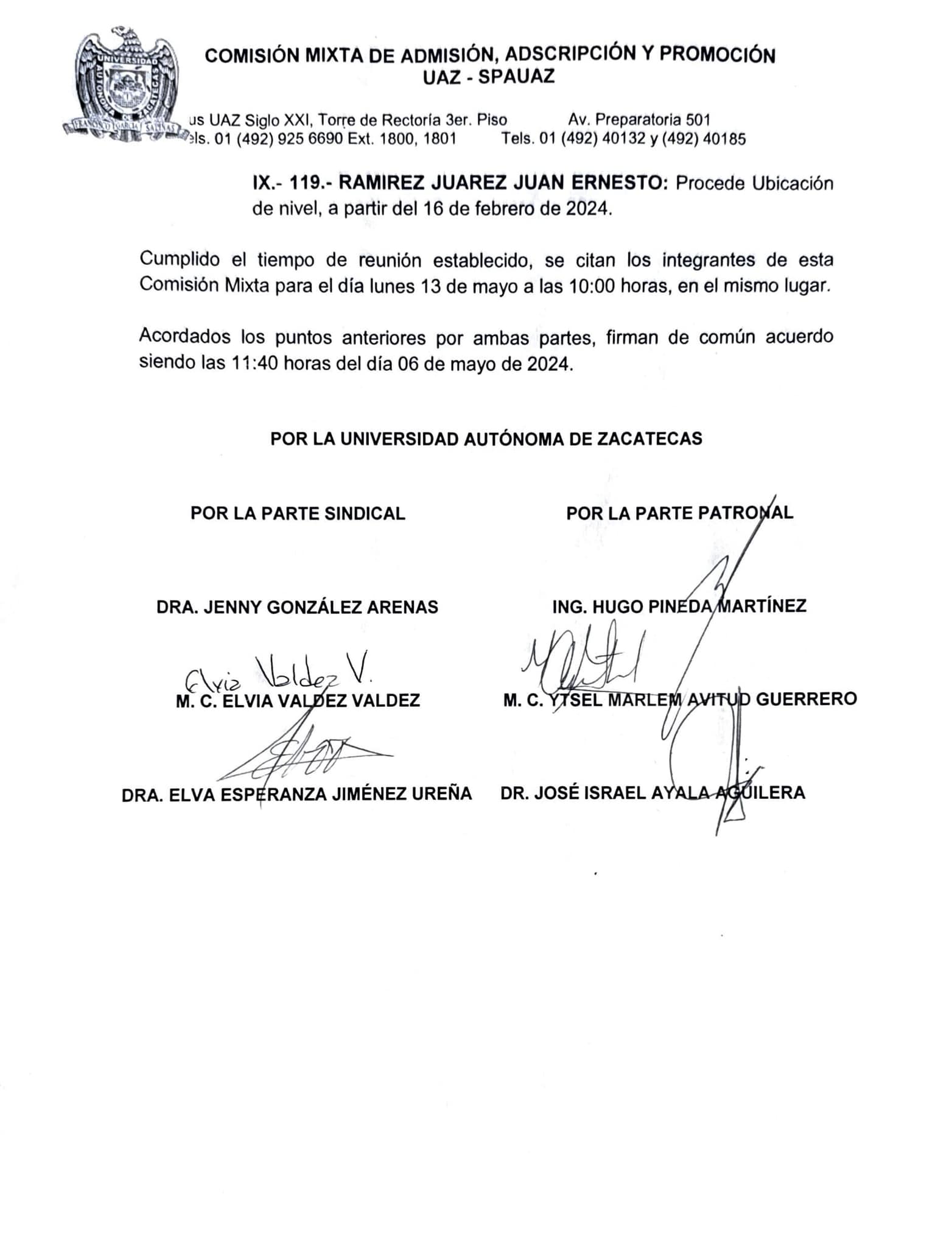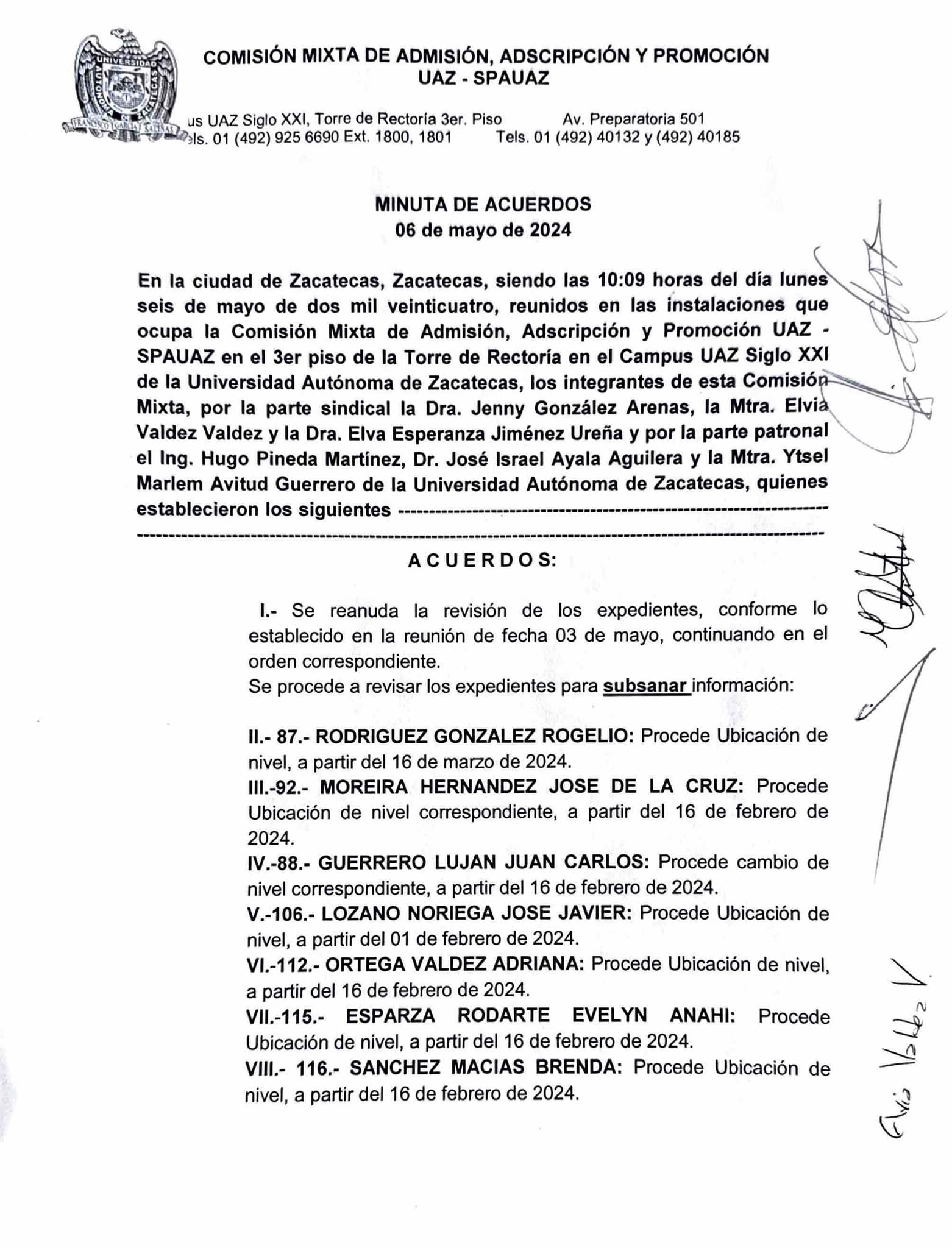Posted in Avisos y Noticias, Secretaría general Minuta de la sesión del lunes 06 de mayo del 2024 de la Comisión Mixta mayo 6, 2024 Cargando... ¿Tarda demasiado? Recargar el documento | Abrir en una nueva pestaña Download [1.69 MB] Más avisos... PADRÓN DEFINITIVO EMPLAZAMIENTO A HUELGA 17 DE FEBRERO 2025 SPAUAZ celebra a los niños exponiendo «voces internas: sueños y alegrías» Finalmente la Administración de UAZ acepta nuestra propuesta de lugar para mesa de negociación Torneo de tiros SPAUAZ
