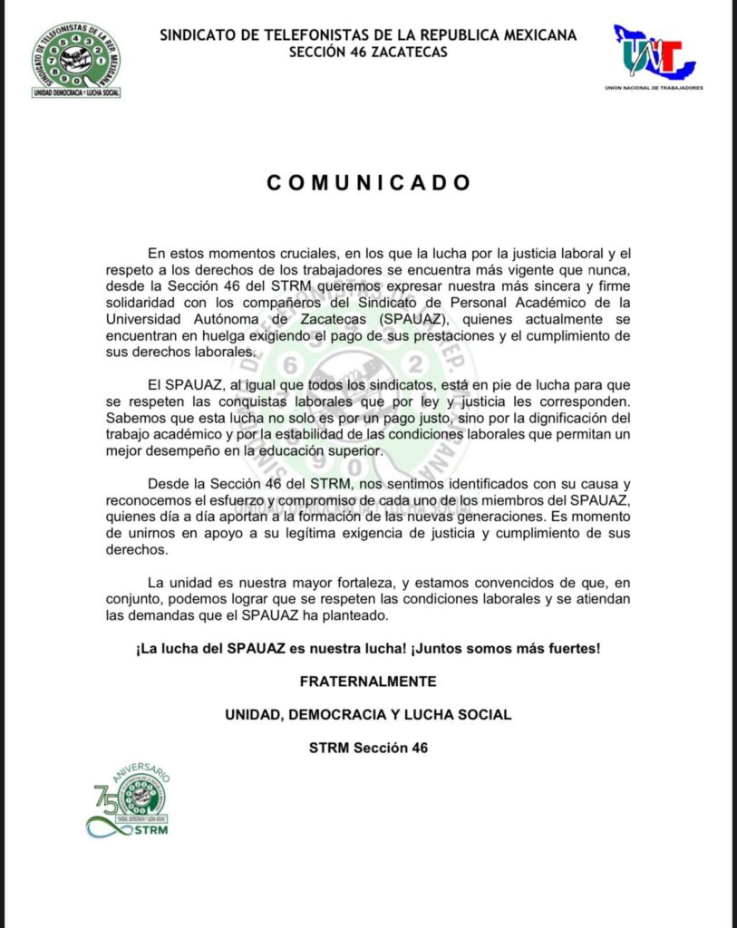 Posted in Avisos y Noticias Agradecemos el apoyo y la solidaridad del Sindicato de Telefonistas de la República Mexicana Sección 46 Zacatecas febrero 19, 2025 Más avisos... Finales torneo SPAUAZ de fútbol Boletos para la rifa de Maestras y Maestros 2023 Acuse de recibido del Convenio de Conjuramiento de Huelga 2025 Guía para la adecuación de estatutos sindicales