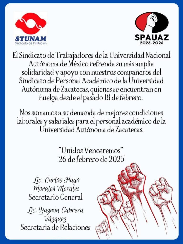Posted in Avisos y Noticias Agradecemos el apoyo y solidaridad del STUNAM febrero 27, 2025 Más avisos... Oficio recibido de parte de la Comisión Mixta donde designan al nuevo integrante por la parte patronal a dicha comisión. Feliz día a las enfermeras y los enfermeros 2023 Invitación a participar en el plebiscito del emplazamiento a huelga 2020 Bono del día del Maestro y Maestra 2022