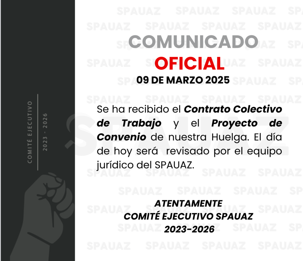 Posted in Avisos y Noticias, Secretaría general Comunicado Oficial 09 de marzo de 2025 marzo 9, 2025 Más avisos... Convocatoria para escuela internacional de verano 2022 Se convoca a una segunda citación al personal académico del Programa de Música Marcha 1ro de Mayo Día del Trabajo 🟥⬛️ ¡50 años de lucha, el SPAUAZ se escucha! Aviso días de atención de forma presencial en el SPAUAZ
