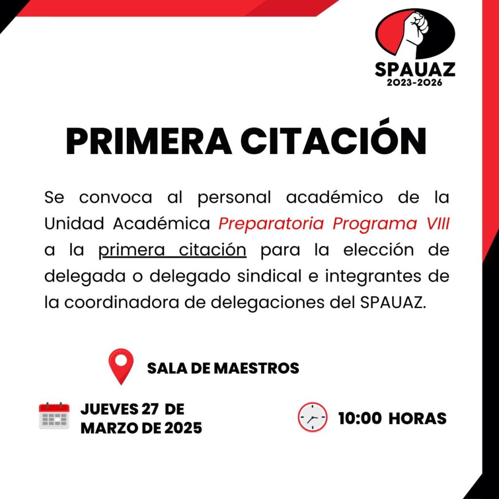 Posted in Avisos y Noticias Se convoca al personal académico de la Preparatoria Programa VIII marzo 24, 2025 Más avisos... El taller de dibujo y pintura del SPAUAZ presenta «Pinceladas desde el alma» Boletín SPAUAZ en la CONTU Citatorio a Comité de Huelga 11 de marzo 2025 Minuta de la sesión del jueves 27 de junio del 2024 de la Comisión Mixta.