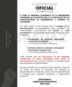 Posted in Avisos y Noticias Comunicado Oficial 27 de marzo 2025 marzo 27, 2025 Más avisos... Felicitación a las abogadas y a los abogados Próxima reunión para conformar la Comisión de Seguridad e Higiene Respuesta al ofrecimiento del rector 13 de marzo 2024 MESA DE NEGOCIACIÓN UAZ – SPAUAZ