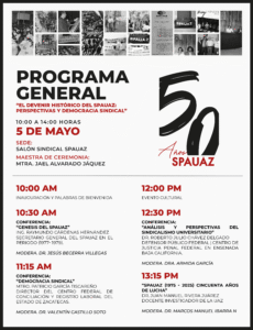 Posted in Avisos y Noticias Celebración 50.º Aniversario SPAUAZ abril 30, 2025 Más avisos... INAH Zacatecas hace donación de material bibliográfico al SPAUAZ Escrutinio de votos del plebiscito ¡Docentes, no nos dejemos intimidar! Si te presionan, denuncia. Comunicado del Colegio Electoral del SPAUAZ 20 de agosto de 2020
