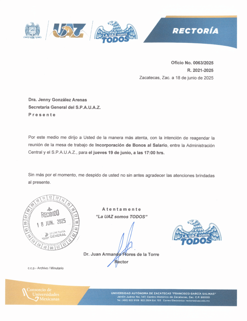 Posted in Actas y Acuerdos Oficio enviado por la Rectoría para reagendar la reunión de la mesa de trabajo de Incorporación de Bonos al Salario. junio 18, 2025 Más avisos... SEGUNDA CITACIÓN INGENIERIA ELECTRICA Tercera Citación Medicina Humana Zacatecas Comité de huelga cita al Rector de la UAZ a reunión el próximo 8 de febrero