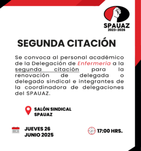 Posted in Actas y Acuerdos SEGUNDA CITACION ENFERMERÍA junio 25, 2025 Más avisos... Primera Citación Medicina Humana Zacatecas Primera citación para renovar delegación en Unidad Académica Preparatoria Programa VII Segunda citación para renovar delegación en Unidad Académica de Ciencias Biológicas Tercera mesa temática del Foro Sindical para la Reforma Estatutaria Integral