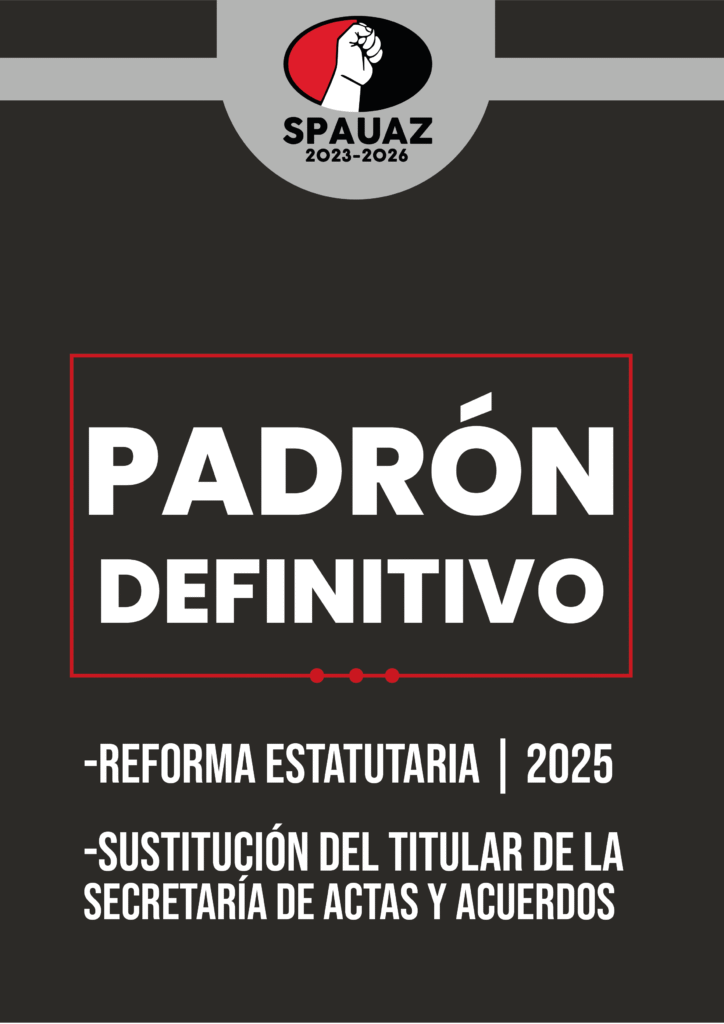 Posted in Avisos y Noticias, Secretaría general Padrón Definitivo Plebiscito Septiembre 2025 SPAUAZ septiembre 24, 2025 Cargando... ¿Tarda demasiado? Recargar el documento | Abrir en una nueva pestaña Download [2.14 MB] Más avisos... Bienvenida semestre enero-julio 2022 Citatorio para Asamblea General 7 de noviembre 2022 Comunicado de los docentes del SPAUAZ a los padres de familia y a la opinión público Minuta de la sesión del miércoles 10 de abril 2024 de la Comisión Mixta