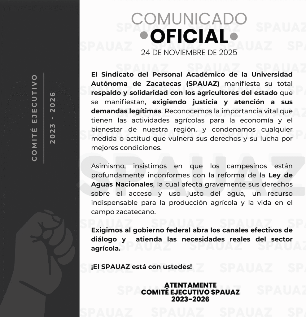 Posted in Relaciones Exteriores El SPAUAZ manifiesta su total respaldo y solidaridad con los agricultores del estado. noviembre 24, 2025 Más avisos... Apoyo a #SITCECyTEZEMSaD Boletín informativo de la reunión de Comité de Huelga/18 de enero 2021 4TA CONFERENCIA NACIONAL DE LA NUEVA CENTRAL DE TRABAJADORES (NCT) Del trabajador académico precarizado al trabajador académico politizado