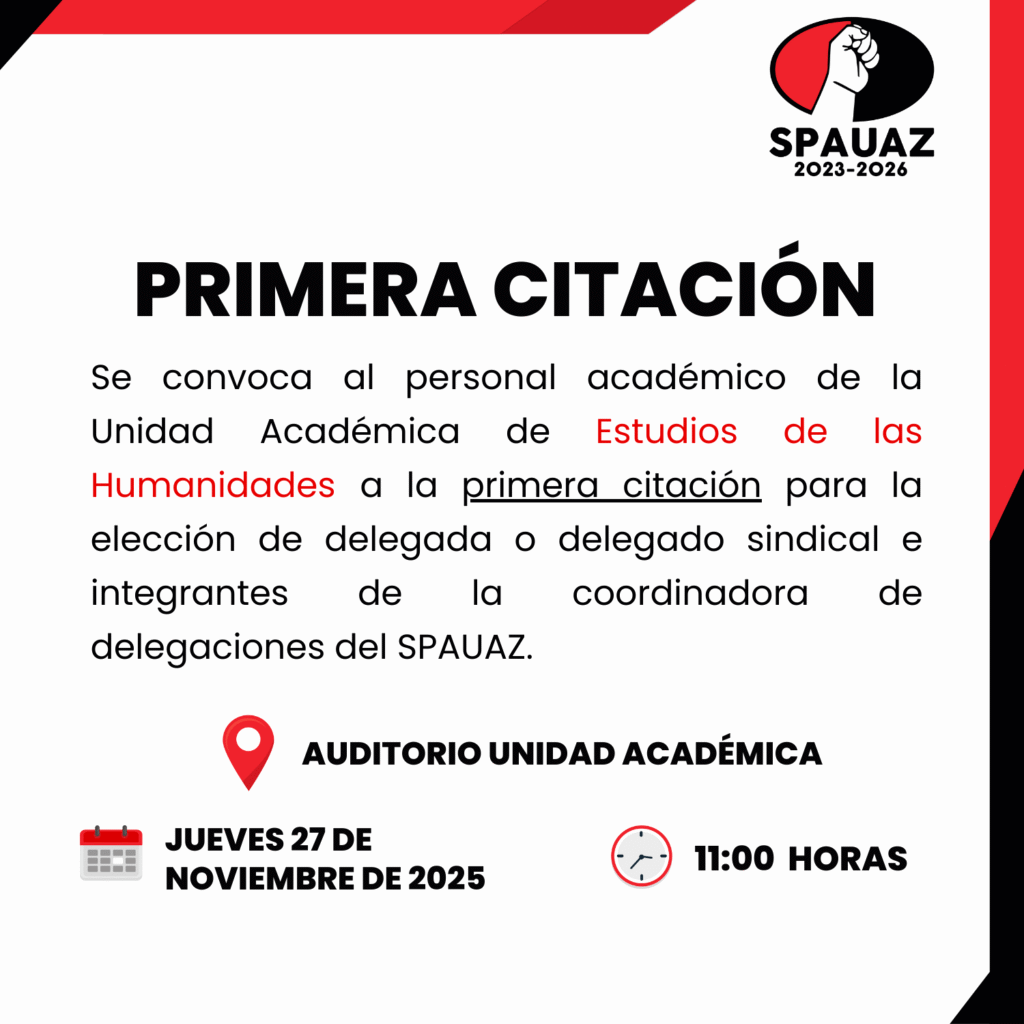 Posted in Actas y Acuerdos, Avisos y Noticias Primera Citación Estudios de la Humanidades noviembre 25, 2025 Más avisos... Primera citación para renovar delegación en Unidad Académica de Ingeniería I Padrón Definitivo Plebiscito Septiembre 2025 SPAUAZ Felicitación a las biólogas y los biólogos Atento aviso a las Delegaciones que no han renovado sus Representantes a la Coordinadora de Delegaciones.
